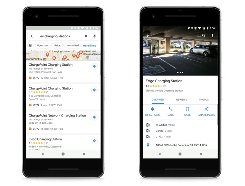 Now, though, you can search for "ev charging" or "ev charging station" and get a list of the nearest options to your current position. As you might expect, Google's implementation of EV charging infrastructure search is more than just physical location, however. It's also offering up charger type information about each spot.