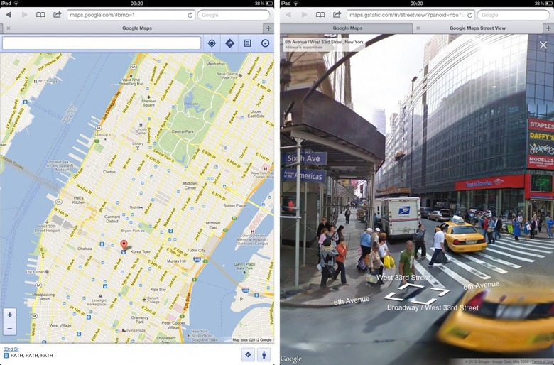 Interestingly, loading up maps.google.com in Android does not bring up the same Street View icon. Instead, users of Android phones and tablets need to go to the dedicated Google Maps app to access the service. [Update: You can in fact access Street View in the Android browser version, but you need to drop a pin on the map first; the Street View icon does not show up by default as it does in the iOS browser] Google has said that it is working on a Google Maps for iOS app, though that isn't expected to be released until later in the year.