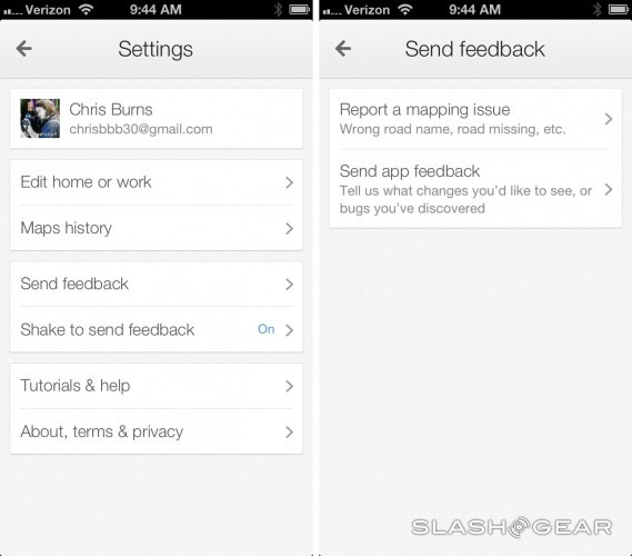 Inside your settings you'll also see the ability to edit your Home and Work locations, see your Maps history (and delete entries, if you wish), and a place to send Feedback. You can also Shake to Send Feedback – this being rather convenient if you're extremely lost and want to complain about it really, really easily. There's also a Tutorials section that allows you to see the gestures you can use to show all of the features in the app.