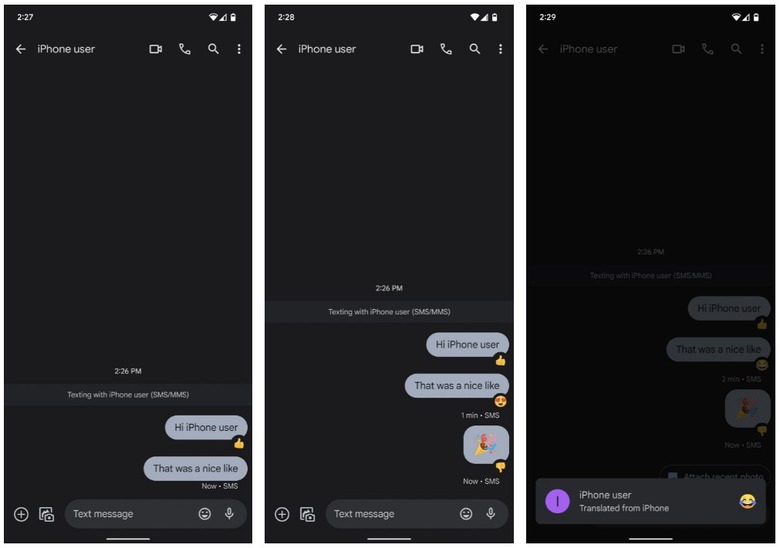 So, for instance, say that you're on Android and you text your iPhone-using friend, "I'll be there in 10 minutes." If they "like" that using iMessage's reactions, for them, it'll show a neat little thumbs up hovering over the message in question. For you, however, you'll see this sent as a separate text message: