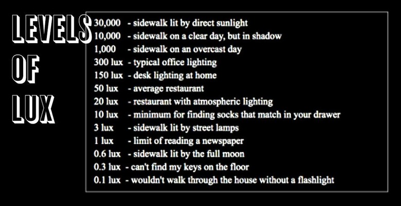 Above you'll see a chart provided by Google which identifies a range of lux. Lux is the amount of light hitting a surface, light per unit area, lux. Lux is measured in lumens per meter squared. According to Google, Night Sight is for light amounts where you either wouldn't walk through the house without a flashlight or you'd be unable to find your keys on the floor – that's dark!