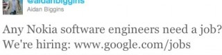Google hasn't exactly had words of support for Nokia and Microsoft in the run up to today's Windows Phone deal announcement, and the search giant has been quick to step in amid Stephen Elop's confirmation of Nokia job losses across the world. Google EMEA recruiter Aidan Biggins gleefully pointed out that Google was hiring, and invited Nokia software engineers to apply.