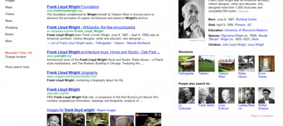 The knowledge graph that appears on the right side of the search results will display all the most basic information about a certain query. For example, a search for architect Frank Lloyd Wright would yield his basic biographical information, links to buildings he designed, and even suggest links to similar architects.