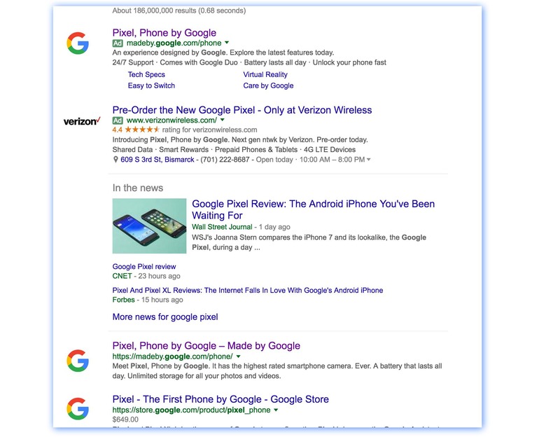 If a new user types "Google Pixel" into Google, several results appear. First, two advertisements – the first from Google, the second from Verizon. After "in the news", the next result is Google again, then Google yet again.