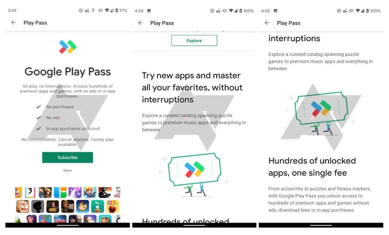 Android Police first caught wind of the Play Pass thanks to an anonymous reader who sent in a variety of screenshots. Google Play Pass seems to take things one step further than Apple Arcade by including both apps and games rather than just games. It also promises an ad-free experience while using Play Pass apps while touting that in-app purchases will be unlocked as well.