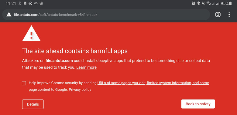 Google has apparently stepped up its efforts to ensure AnTuTu's benchmarking tool has no place on Android, at least on those devices certified by Google. Trying to download the APK from AnTuTu's website, which is now the official way to get the app, will result in a glaring red warning about the site containing harmful apps.