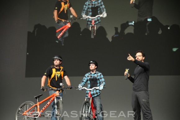 "It's a pretty big roof, actually" Brin said, "which is good for their landing." The divers we met by a number of stunt bikers, who then proceeded to jump ramps between the roof levels – all wearing Project Glass – and then pass information to another person who promptly abseiled down the side of the Center.