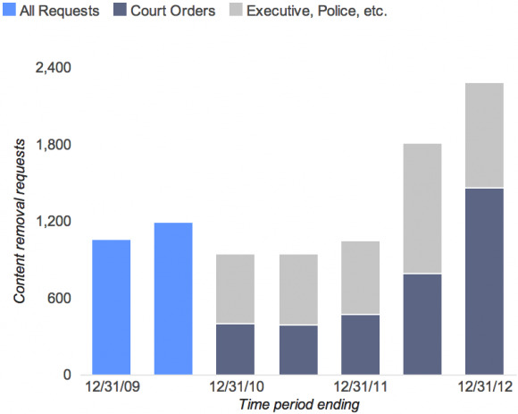 That number is up from the 1,811 takedown requests made regarding 18,070 pieces of content during the previous half of 2012, and it's the highest number of takedown requests that Google has seen during a six-month period since the search giant began to offer transparency reports three years ago.
