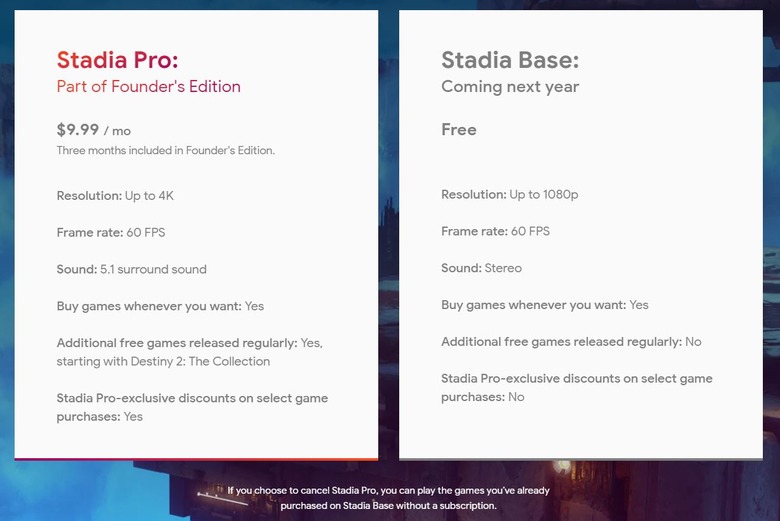 Beginning sometime in 2020, you'll also be able to sign up for Stadia Base, which caps resolution at 1080p but doesn't cost anything monthly – in other words, you'll buy the games you want to play and then you'll be able to stream them through Stadia at no additional cost.