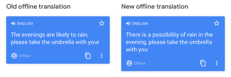 Google is improving that with its latest app update. A total of 59 languages have received offline translation accuracy improvements, some more substantially than others (Polish, Korean, Hindi, and more). Google provides an example of this improvement in the screenshot above; though the first offline translation is comprehensible, the second translation is grammatically correct and doesn't leave anything up for interpretation.