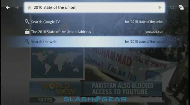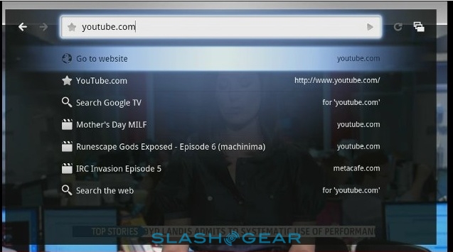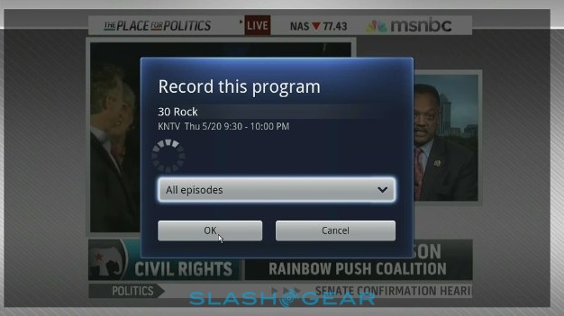 In a demonstration punctuated with technical problems, as the Bluetooth keyboard refused to hook up to the Google TV box, the Google IO team showed how viewers would be able to search for channels or for specific programs via an on-screen search box, overlaid on top of whatever was being fed from the cable TV tuner box. It's also possible to set a timed DVR recording direct from the UI.