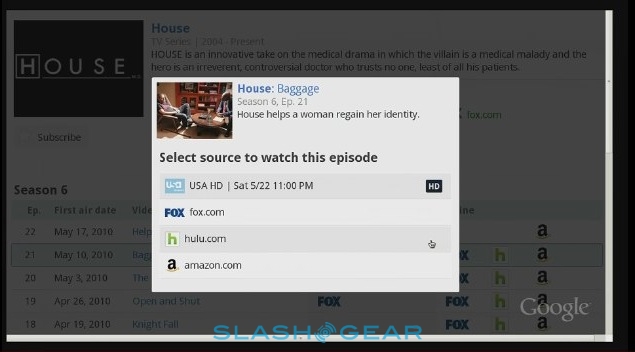 Type in a search query, however, for a show and you can also see online content as well as what's available through broadcast TV. For instance, a search for House brought up Amazon, Hulu and Netflix results, including options to stream content as well as buy it on DVD, and you can browse to the websites without having to change inputs on the HDTV itself. Google have worked with Amazon and Netflix to integrated things like the Netflix Instant Queue directly into the Google TV interface.