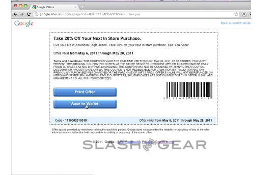 Credit Card, Coupon, and Reward Coupon. These are the three items that are thus far available in the Google Wallet system that you'll be able to use when checking in at stores, purchasing items like what Google showed off at the May 26th event in NYC, a pair of shorts from American Eagle. The system was further detailed from start to finish: look up the shorts at home, find a coupon, transfer the coupon to your phone the same way you'd transfer an app via the Android Market, and bring the phone to the store to tap. All you've got to do is sign!