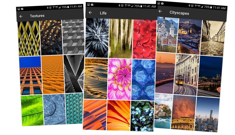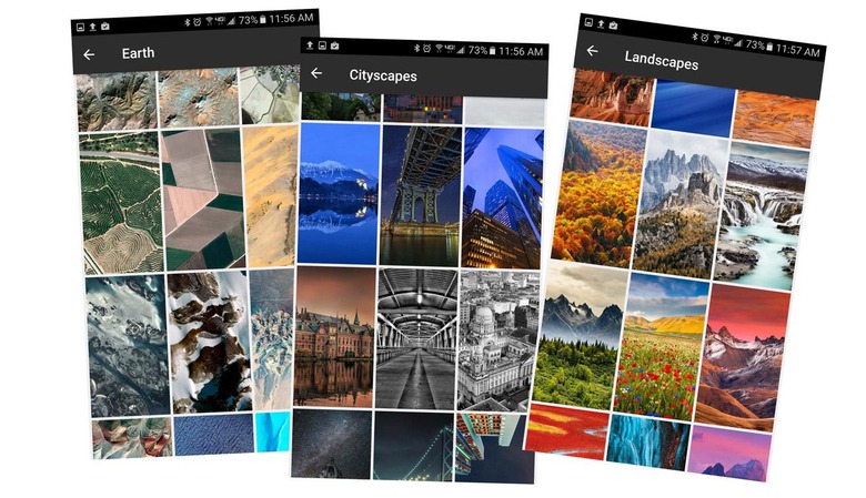 Users are able to select from On-device wallpapers, Earth, Landscapes, Cityscapes, Life, and Textures. If the user has other wallpaper launchers these will appear as well, inside this app. These screens remain as they were before the app, while the app's folders have other options. Individual folders from Wallpaper also include information and links to artists involved.
