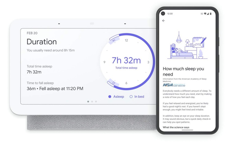 Over time, Google says, the new Nest Hub will learn your sleep patterns and be able to recommend an ideal sleep routine. Based on 14 nights of sleep data, it'll make suggestions for when to go to bed and when to set an alarm to get up. It might also encourage changes in lighting or setting a reminder to go to bed on time. Guidelines from the American Academy of Sleep Medicine will also be presented.