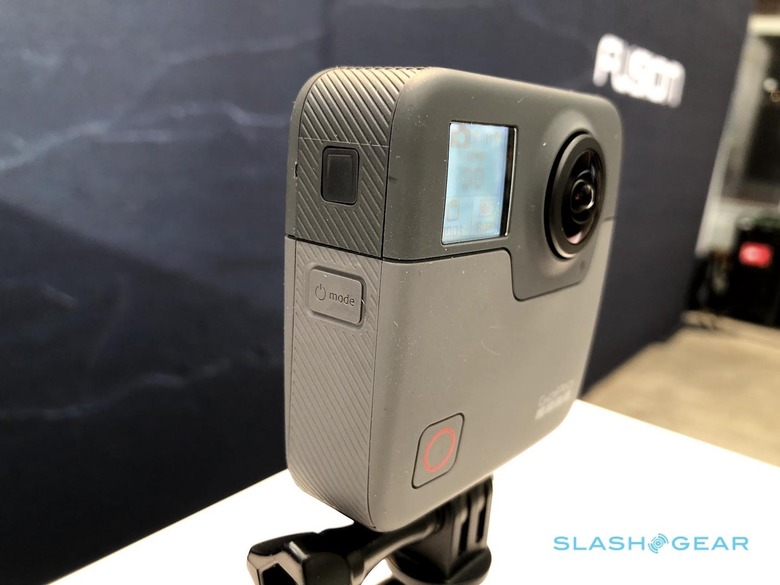 Right now, there's no single-camera mode for a 180-degree perspective, though GoPro tells me that's something the company is considering as beta testers have requested it. At the moment, though, the Fusion won't start recording if only one microSD is installed. There's no color touchscreen as the HERO6 gets, of course, just a small monochrome LCD with battery and recording status, a button on the front to start recording, and a side button for power and mode.