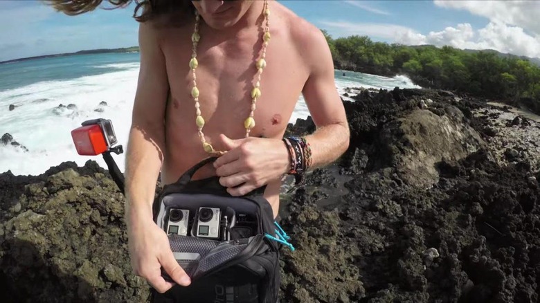 The bag's camera compartment features a soft liner as well as spots for microSD cards and batteries. There's a chest mount for recording first-person view footage, as well as shoulder strap support for an optional 3-Way accessory that enables over-the-shoulder camera recording.