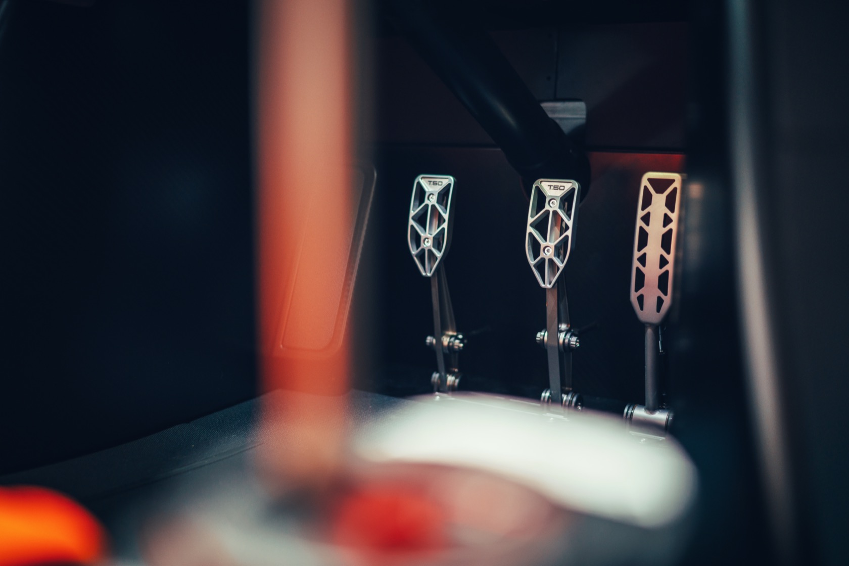 Inside there's room for three, with the central driver's seat flanked by two passenger seats. Again, there's a focus on tactile, authentic materials and controls, whether that be the carefully weighted titanium gearshifter, the milled aluminum pedals – with a weight saving web-like pattern on the clutch and brake – or the carbon fiber three-spoke wheel. Paddles behind the wheel are for the horn and flashing the headlamps; thumb-buttons control the indicators.