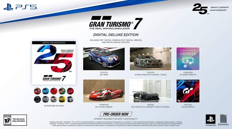 Then we have the physical 25th Anniversary Edition for $89.99. This version of the game comes with a PS5 disc in a steelbook case along with a voucher for a digital copy of the game on PlayStation 4. Players will also get 30 manufacturer/partner avatars, the official Gran Turismo 7 soundtrack, a Toyota GR Yaris with country-specific livery (which sounds like a nice touch), and 1.1 million in-game credits. This edition will also come with the three-car pack listed above for the Launch Edition.