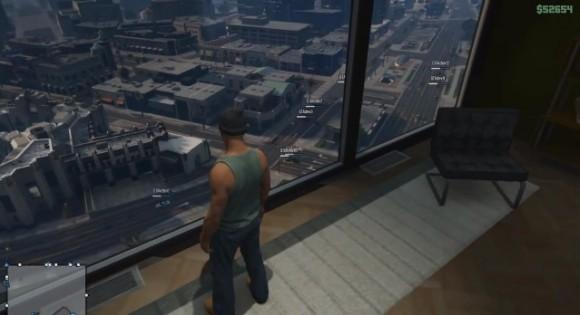 We also get a quick look at multiplayer in Grand Theft Auto V, which Rockstar is calling Grand Theft Auto Online. The gameplay video doesn't show much — merely just a guy looking out from a building at all these other players while a fighter jet passes by. And yes, it looks like multiplayer will allow the ability to fly fighter jets.
