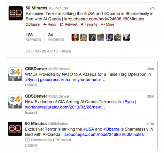 It looks like CBS is the latest victim in a series of Social Network account hacks that seem to be prevalent this year. Today, CBS stated that several of its Twitter accounts, including 60 Minutes, 48 Hours, CBSDenver, and its official Twitter account were all compromised earlier today. The hackers used the accounts and tweeted things like, "General Dempsey calls for #Obama's arrest under new anti-terror laws #48hours".