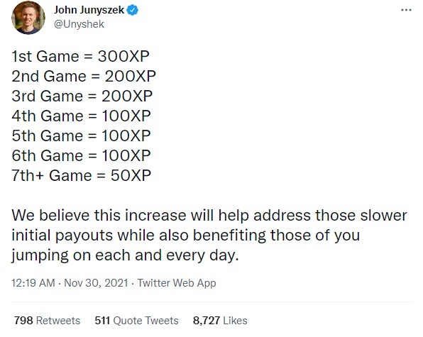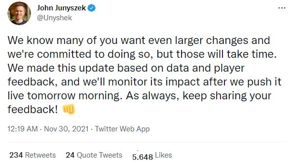 After revealing the bonus XP changes, Junyszek followed up with an interesting tweet that suggests even more significant changes are on the way. "We know many of you want even larger changes and we're committed to doing so, but those will take time," Junyszek said. "We made this update based on data and player feedback, and we'll monitor its impact after we push it live tomorrow morning. As always, keep sharing your feedback!"