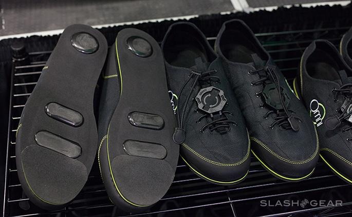 When it was nearly my turn, they asked for my shoe size, and I strapped into a pair. The shoes look somewhat normal on the top, save for the plastic hexagon strapped to the laces. This is where the foot tracking sensor goes. The bottom of the shoes were very different than your average sneaker. There are three plastic pieces which helps your feet to easily slide over the plastic surface of the Omni. It also helps you slide on most other surfaces as well, so you'll want to be careful.