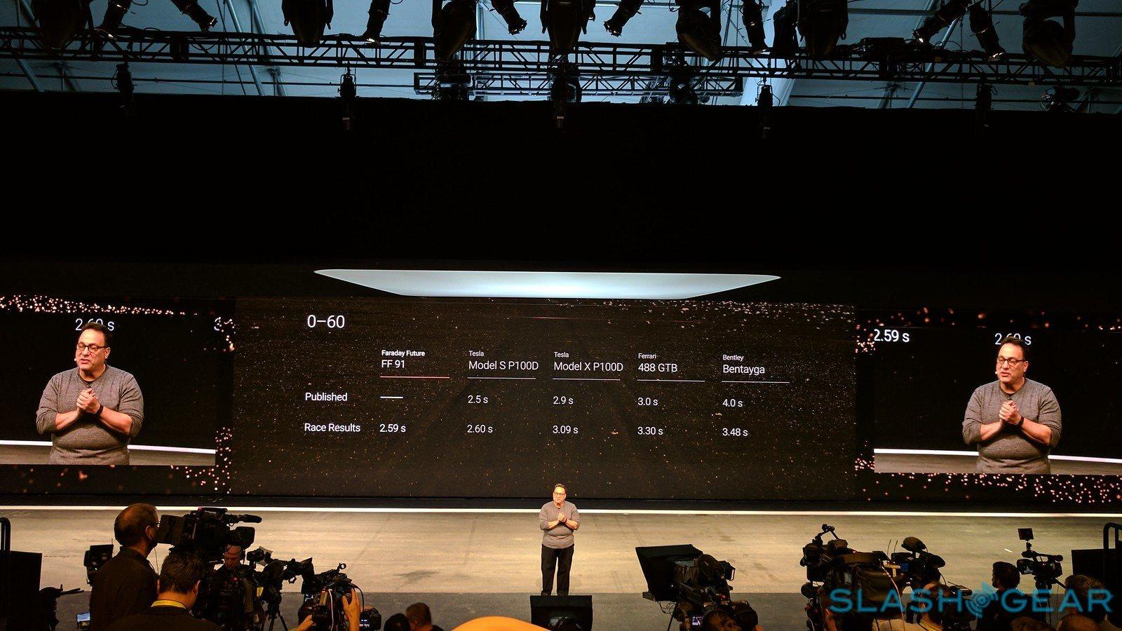 Faraday also says that the FF 91 has the "world's most powerful EV propulsion system," which has a peak power of 1050 horsepower. Faraday's quote for zero to 60 times tops out at 2.39 seconds, and the company showed a video of the FF 91 beating the other cars like the Model S P100D, the Model X P100D, the Ferrari 488 GTB, and the Bentley Bentayga in a 0-to-60 race.