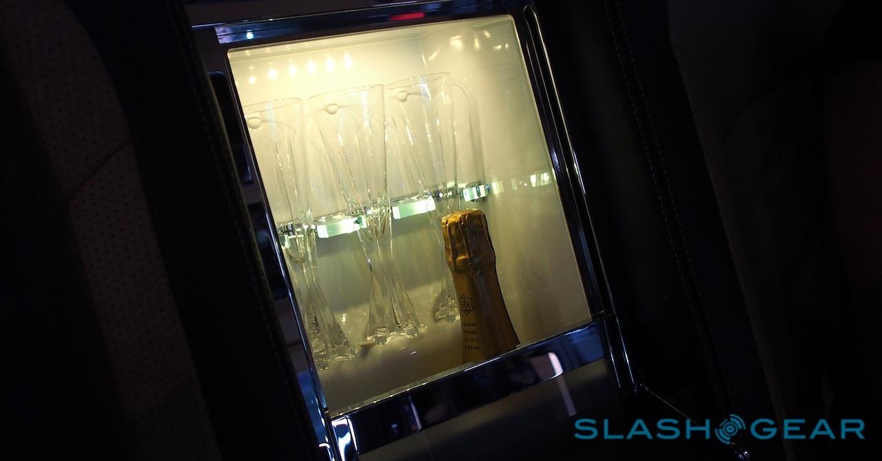 Pull down a panel between the seats, meanwhile, and there's a fridge there – the frosted glass door whirs open electrically at the push of a crystal button – with an optional set of crystal champagne flutes and room for a bottle of bubbly or two. Bizarrely, the flutes are each designed to match the Mulsanne Speed's exclusive wheel finishes outside. Arguably more useful is the fact that, rather than anything so mundane as a regular cup holder, you get a pop-out champagne glass holder instead.