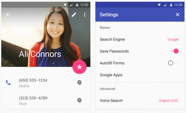 In Android L and with Material you're going to see color, as Google puts it, "inspired by bold color statements juxtaposed with muted environments, taking cues from contemporary architecture, road signs, pavement marking tape, and sports courts." Google furthermore suggests that developers "emphasize bold shadows and highlights" and that they "introduced unexpected and vibrant colors" in their app designs.