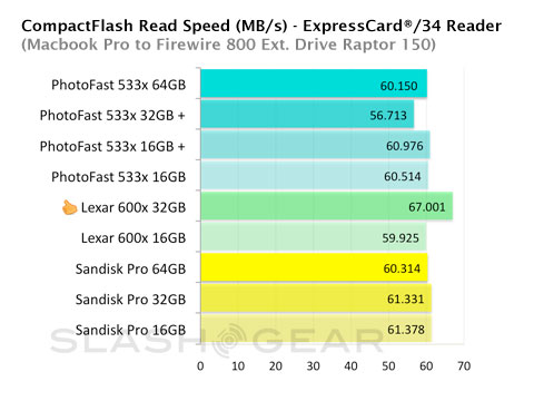 Second place is jointly held by two cards, the regular-speed 533x 64GB PhotoFast and Lexar's 600x 32GB. Data copied at a rate of 90MB/s from the ExpressCard to the SSD. A similar outcome was also observed using the FireWire reader; the pair performed ahead of their competition, but still dropped about 10 MB/s when using the FireWire interface.