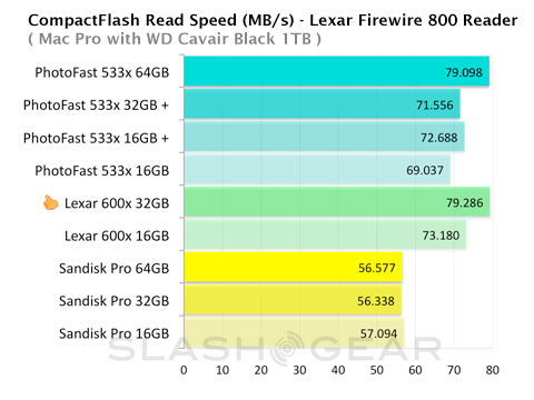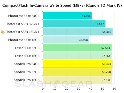 Both the Lexar 600x and SanDisk Extreme Pro series delivered fast writes, but the PhotoFast 16GB 533x plus stood out as a hair faster than the rest. However, the company's larger capacity 533x Plus card couldn't sustain the same level of performance compared to Lexar and SanDisk. The Plus version of the 32GB CompactFlash from PhotoFast dropped roughly 6MB/s weighed against its 16GB sibling.