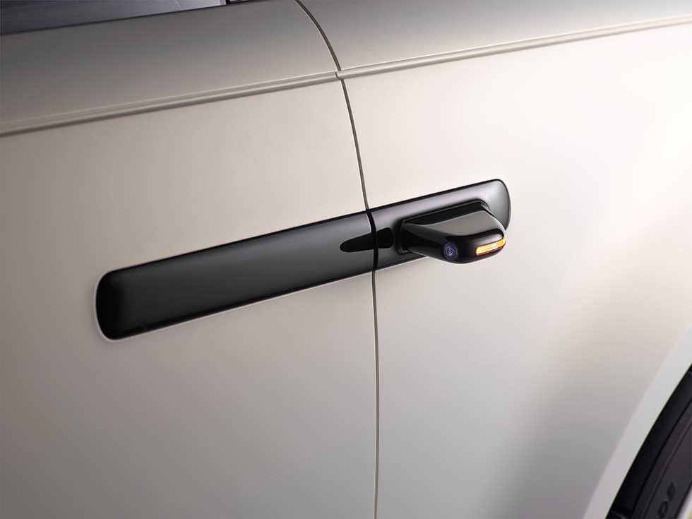 Inside the car has two bench seats making the interior more like a living room than a car. The front bench has grey fabric, squabs, and armrests with wood finish accents. The rear seats have seatbelts designed to retract out of the way making it easier to get in and out of the car. One of the coolest design features are the wide backwards opening doors to make getting into and out of the front and back seats easier without resorting to four doors.