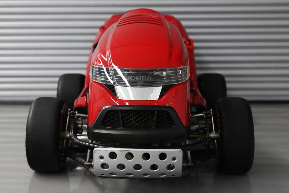While being insanely fast, the Mean Mower looks like a Honda HF 2622 lawn tractor. It can cut grass still using a pair of carbon fiber blades and a pair of electric motors to spin them. A chain runs to the rear wheels and the power is from a Honda Fireblade motorcycle engine.
