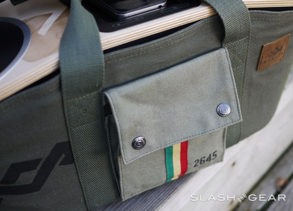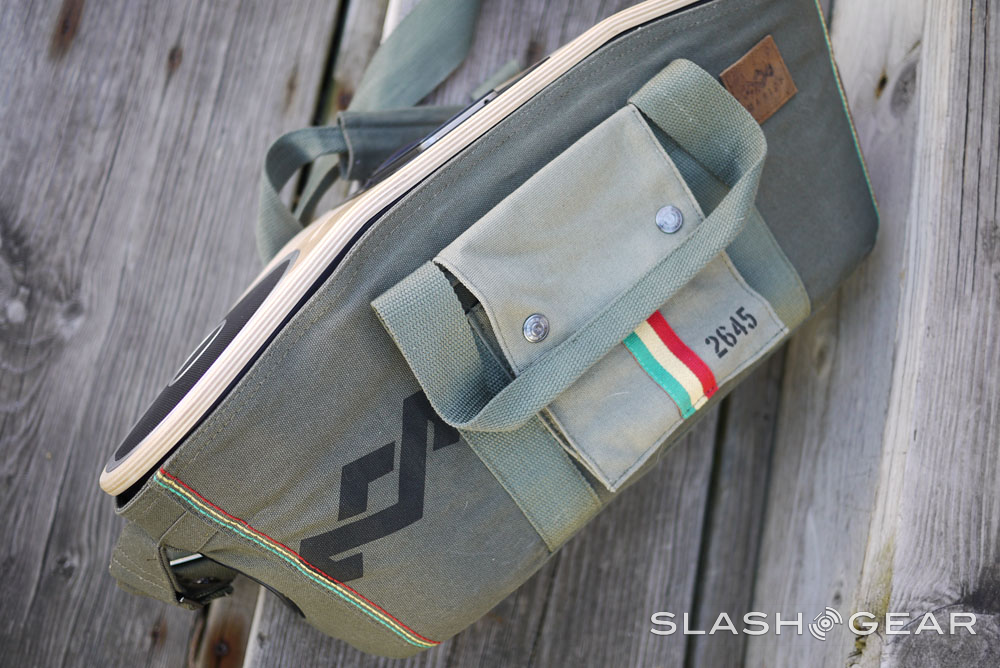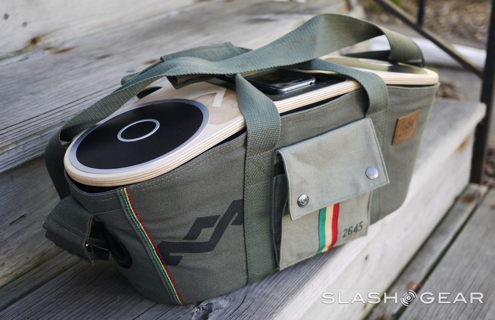 This month we've gotten the opportunity take a peek at the House of Marley Bag of Rhythm, a massive carry-along amplifier for your iPhone and/or any other device with a headphone jack. The idea here is that you carry this beast along with you wherever you want to go jamming, and turn the twin 1-inch tweeters and 4.5-inch high-definition woofers out on the world to bring sunshine and positivity to your friendly neighbors. What you'll get is an aesthetically (and acoustically) lovely unique piece of equipment that'll fit any one of your iPods just perfectly.