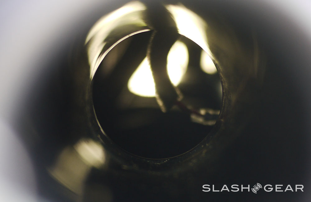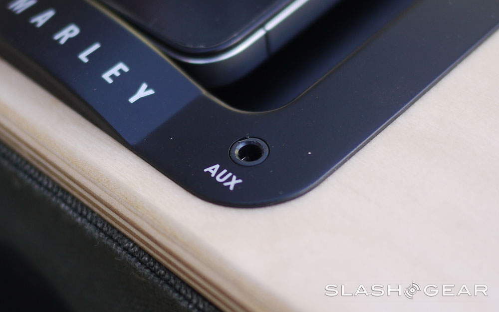 The sound quality does seem to be essentially the same regardless of if you're playing through the AUX jack or your iPhone's proprietary jack, both work great. The whole device has only two controls: power and volume – volume then controlling either your iPhone/iPod's volume output or the overall volume of whatever you're playing through the AUX jack. You can blast sounds out of this speakerbox only when you've got it plugged into a power jack (the port for this being under the pocket on the side of the case) or if you've got a swath of D batteries placed in the bottom of the machine.