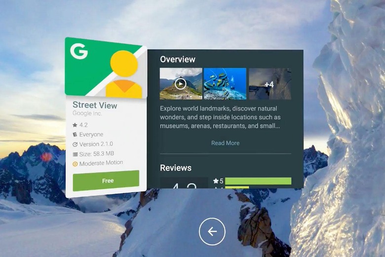 Above you'll see a screenshot of what Google Play will look like in virtual reality. This includes 360 video and photo previews of the app or VR experience.