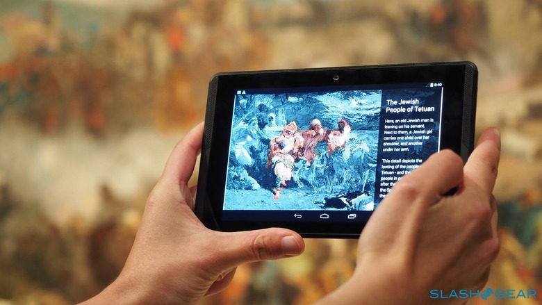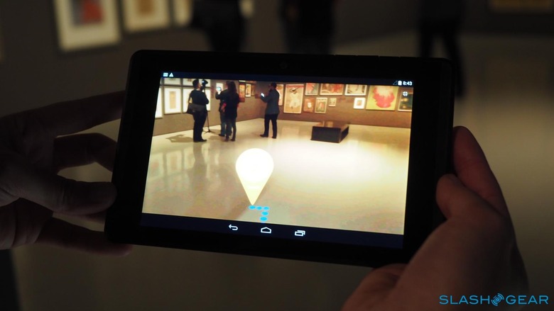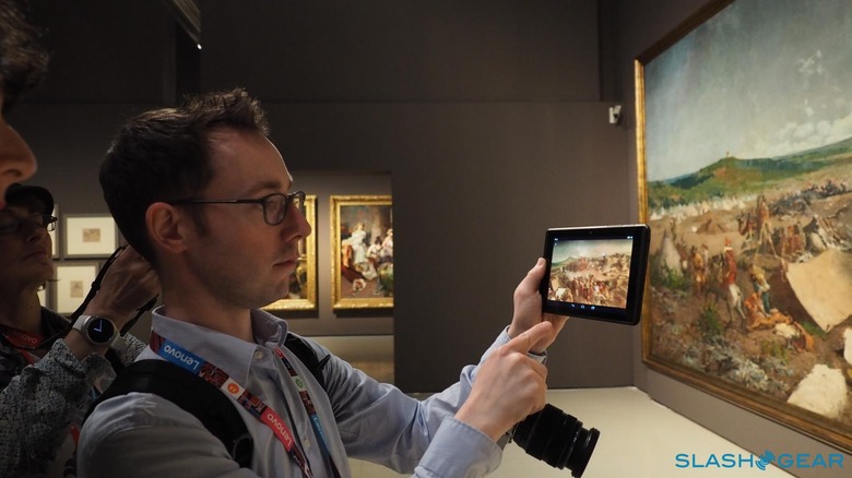 On top of that, Tango sprinkles a liberal amount of augmented reality. Once we reached a painting, holding the tablet up in front of it revealed a few tap-points hovering over it. Selecting those pulled up more information about the art: who the pictured people were, perhaps, or what the symbolism involved meant.