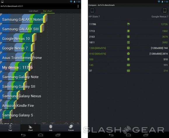 The HP Slate 7 doesn't rock the fastest internals for a 7-inch tablet, but it at least holds its own against similar slates, most notably the Nexus 7, which the Slate 7 scored almost near to what the Nexus 7 could earn, with an 11,800, compared to the Nexus 7's 12,700 in AnTuTu. However, that's mostly where the surprising figures end.