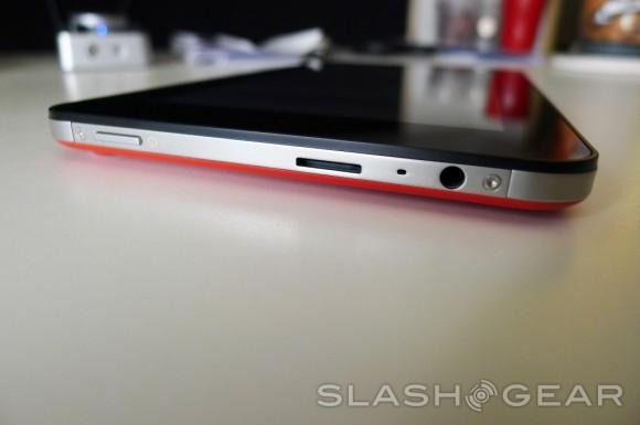 As for ports, the Slate 7 has the usual buffet available: power button on the top; volume rocker on the right side; microUSB jack and speakers on the bottom; and the headphone jack, microphone, and microSD card slot packed in tightly on the top opposite the power button. The positioning of the microSD card is a unique one. Rather than being situated on the side covered by a flap, it sits on the top edge like a slot-load optical disc drive. It's odd at first, but we rather like the design of it.