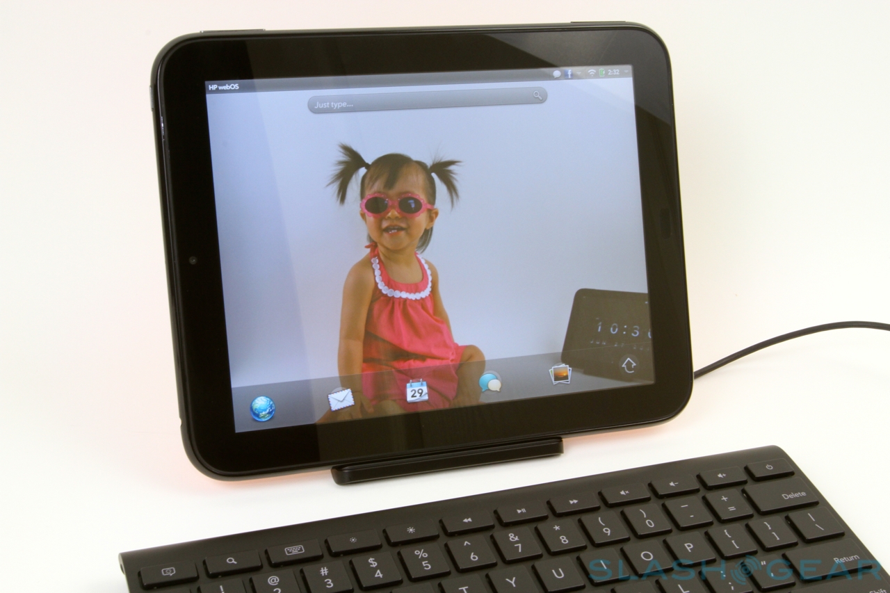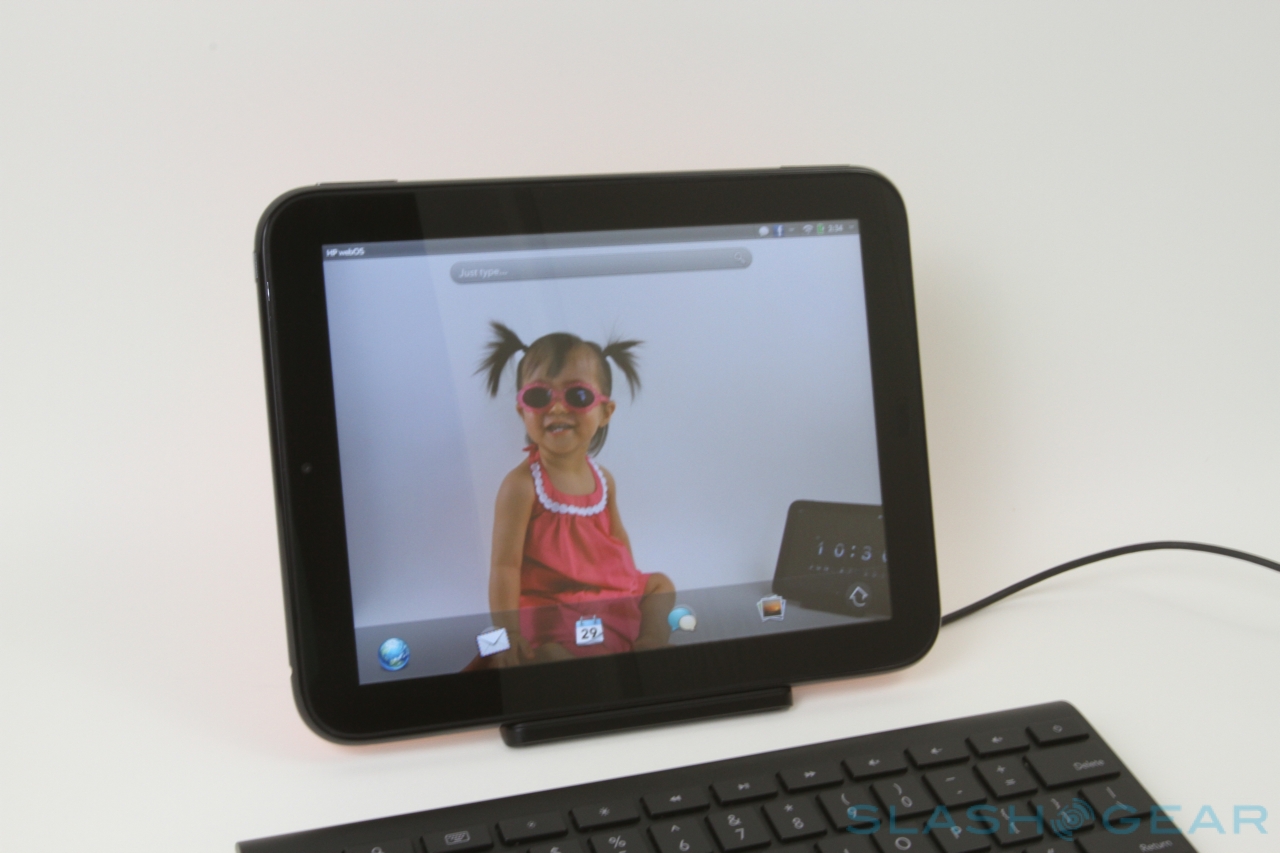 Just as the original Pre had its Touchstone inductive charging dock, so the TouchPad has a wireless dock of its own. Now shaped like an easel, and so supporting the tablet in both portrait and landscape orientation, it automatically charges the TouchPad when docked as well as loading up the Exhibition app. This basically turns the slate into a digital photo frame, by default showing a selection of photos from the gallery along with date and time. Dig into the settings, however, and you can choose specific images to scroll through or the agenda from the webOS calendar. It's also possible to have photos pulled down from Facebook galleries, a great way of keeping up to date with new images your friends add.