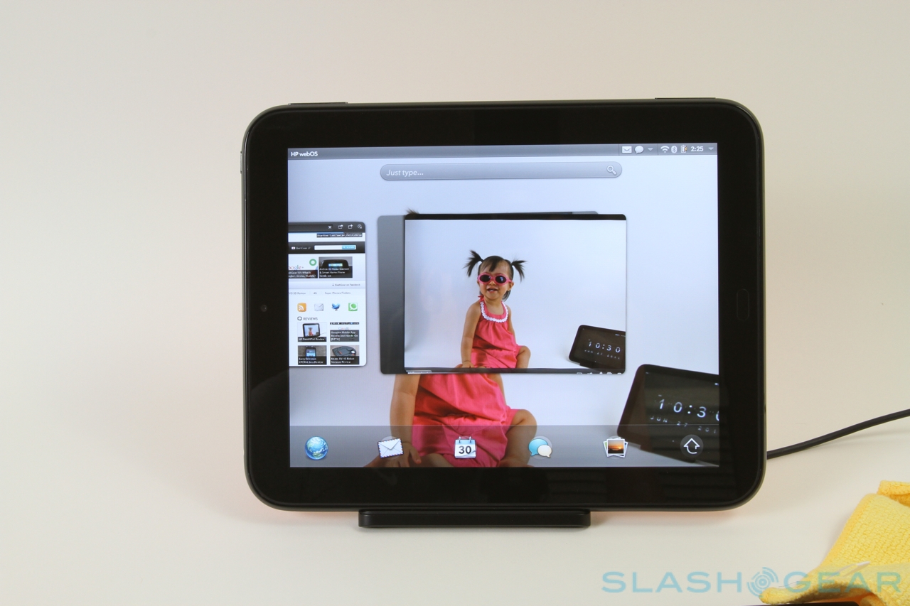 The display itself is a 9.7-inch LCD IPS panel with LED backlighting, matching the iPad's 4:3 aspect ratio and 1024 x 768 resolution. The capacitive touch recognizes multitouch gestures and apparently has a toughened coating for easier cleaning, though it's not a Gorilla Glass panel as Samsung uses on its tablets. As you'd expect from an IPS panel, the viewing angles are broad no matter whether you have the TouchPad in portrait or landscape orientation, though we did find the colors were a little more yellow than the purer whites on the iPad 2. Still, it's a bright and usable display.