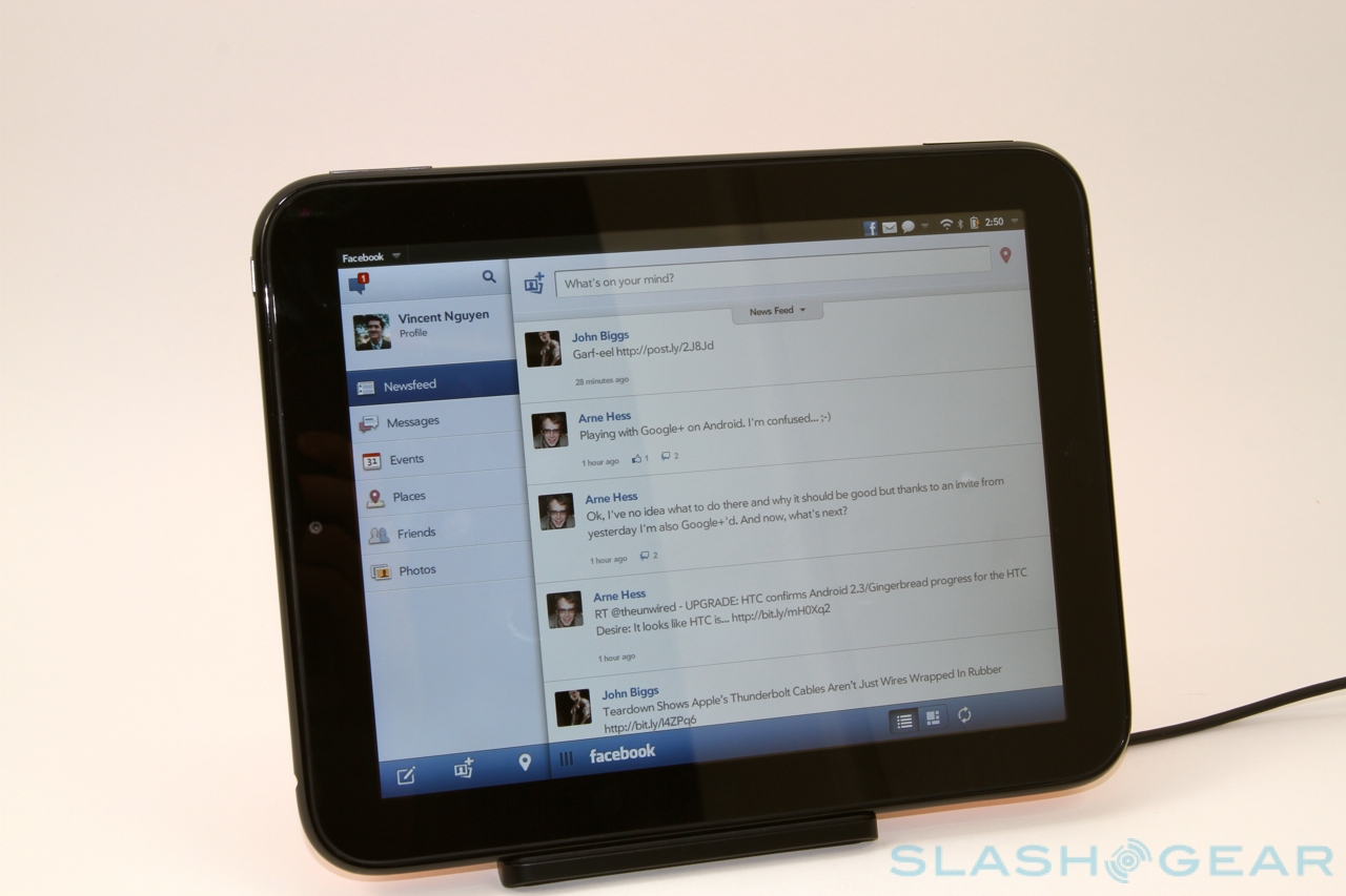 In contrast, HP's Facebook implementation is perhaps the best we've seen on a tablet to-date. The company – not the social network – cooked up a new Facebook app specifically for the TouchPad, with a two/three pane design that supports your wall, friends walls, messages, Places – with support for checking in and finding nearby contacts, with mapping provided by Microsoft's Bing Maps – and galleries, including the ability to upload shots directly to a new or existing album. The only key things missing are Facebook Chat support and the ability to log in as the admin of a group or fan page you manage. Otherwise, it's an app Facebook itself could learn from.