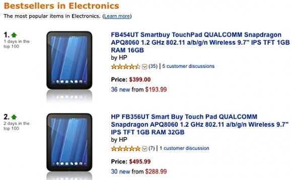 Instead, Amazon is listing the 16GB HP TouchPad at its regular $399 price and the 32GB model at $495.99. Third-party vendors on Amazon, however, are offering better prices, as low as $193.99 for the 16GB model. Still, it's interesting how sudden the tablet has hit the top spot, being only its first day in the top 100, and that it has beat out Amazon's own Kindle e-reader.