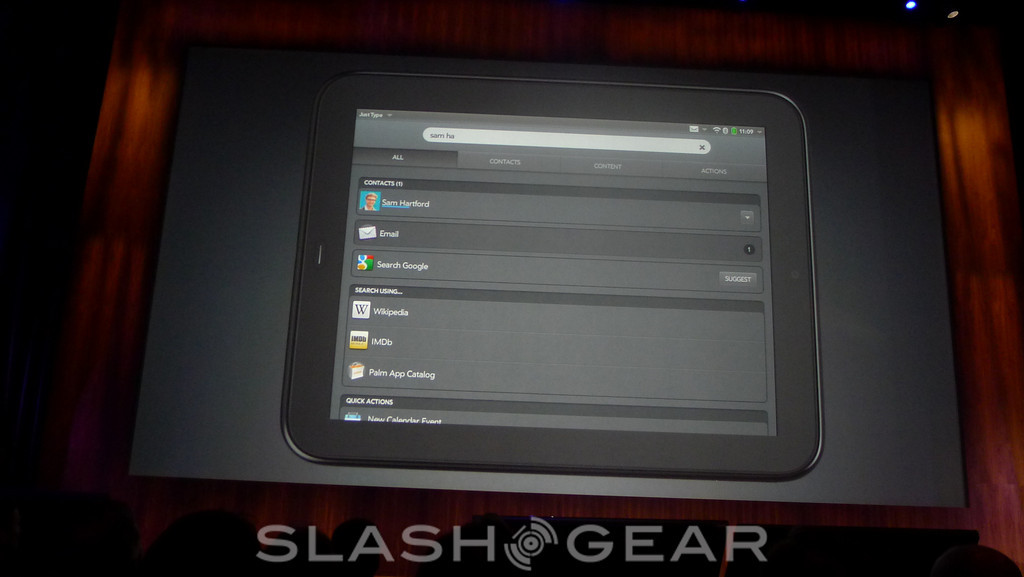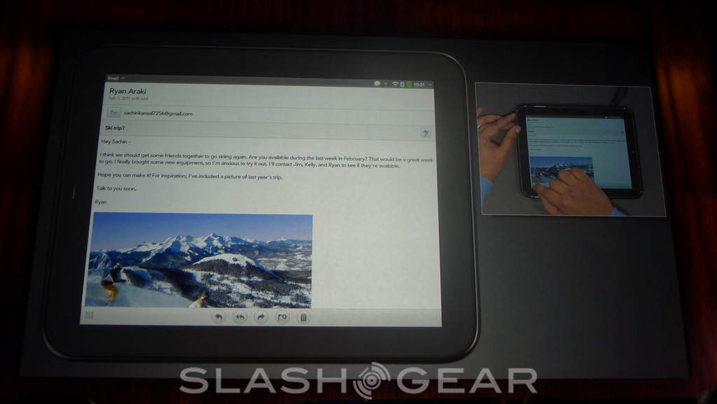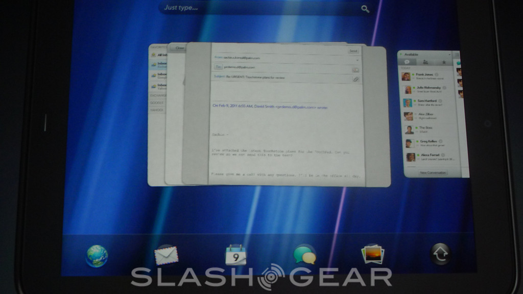The HP TouchPad offers either 16GB or 32GB of onboard storage and Flash Player 10.1 support, but it's the updates to webOS 3.0 that HP is particularly pushing with the new slate. As well as Synergy, and phone-to-tablet communication (which flags up calls and SMS from the phone on the TouchPad, where you can answer and respond to them), the various webOS apps have also been adapted to suit the higher resolution screen.