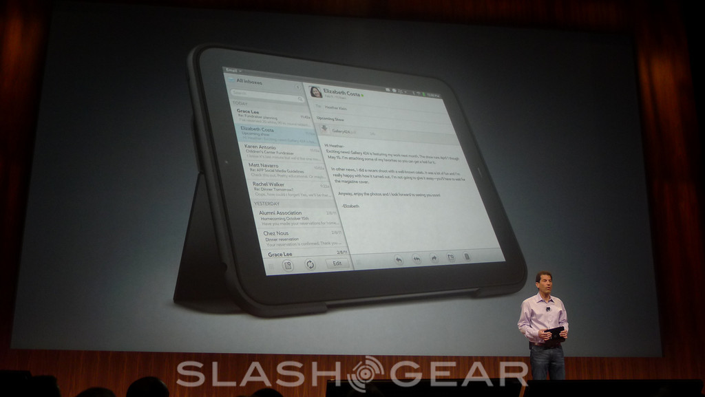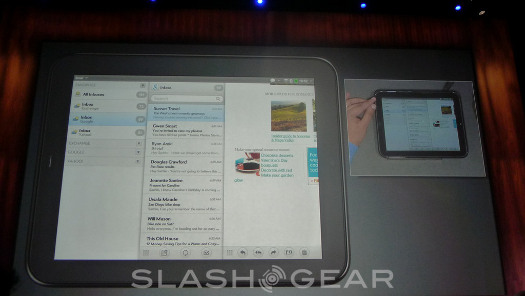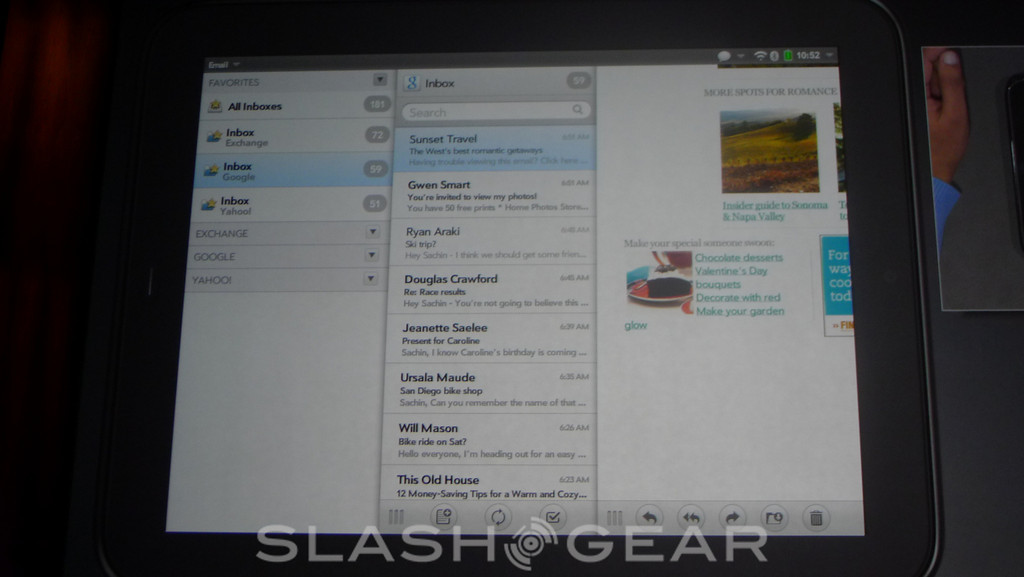Email now gets a multi-pane UI, showing the inbox at the same time as a message for instance, and allows for multiple selections and local content search. Contacts, too, has been updated with HP's new super-scrolling feature, while the calendar – which still uses Synergy to pull in information from Exchange, Google Calendar and other sources – now allows for multiple calendars to be shown at any one time.