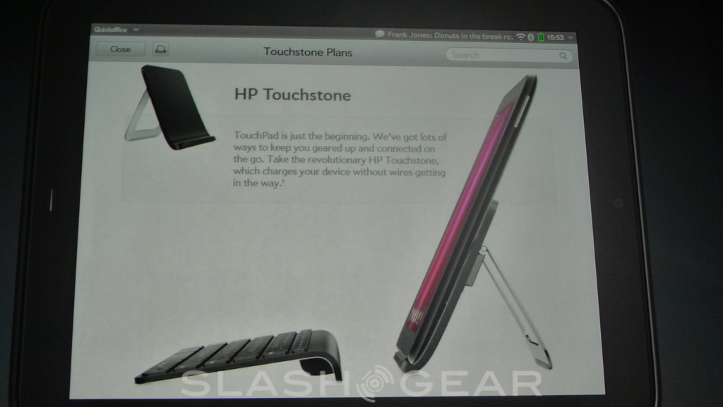 Like the HP Veer and the HP Pre3, the TouchPad supports HP's updated TouchStone technology. In addition to wireless charging – with a neat desk stand – there's touch-to-share support between the three devices. Tap them together, and information can be wirelessly transferred across. The Touchstone desk stand automatically kicks the TouchPad into "Exhibition Mode"; the tablet is context-aware, knows whether it's at the office or at home for instance, and so automatically shows information – photo slideshows, a calendar, dock-specific apps or just the time – suited to its location.