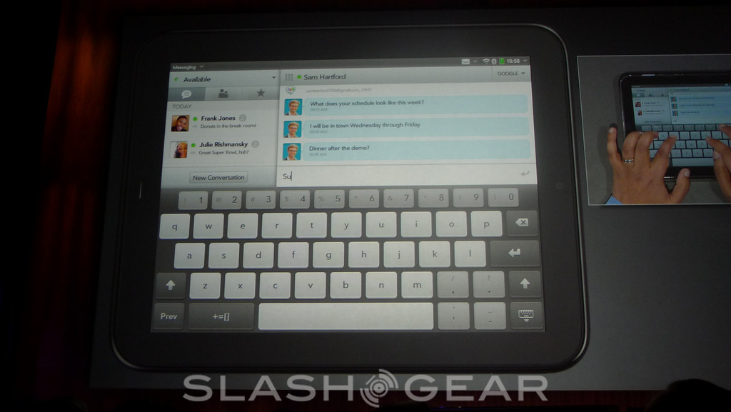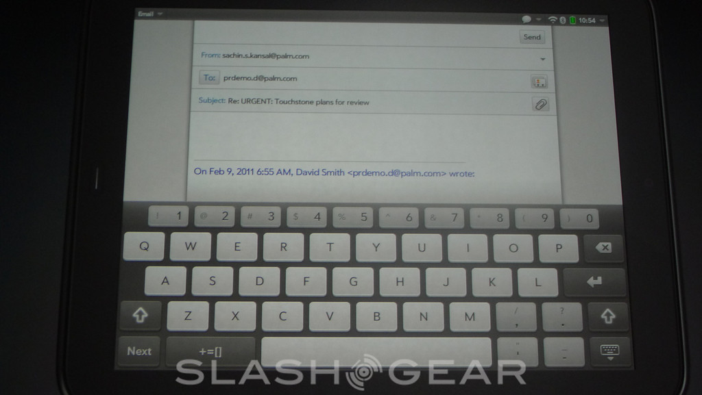 A single control button pulls up webOS' "card view" of open apps, or pulls up the application launcher, and in 3.0 it's now possible to stack apps together. Notifications, too, can be handled individually or dismissed as a complete stack. Finally, there's a virtual keyboard with a dedicated number row that, HP suggests, will reduce keyboard layout switching (as you find on the iPad, for instance). It can also be resized, so if you can handle tiny keys then you can save more of the screen for content, or vice-versa.