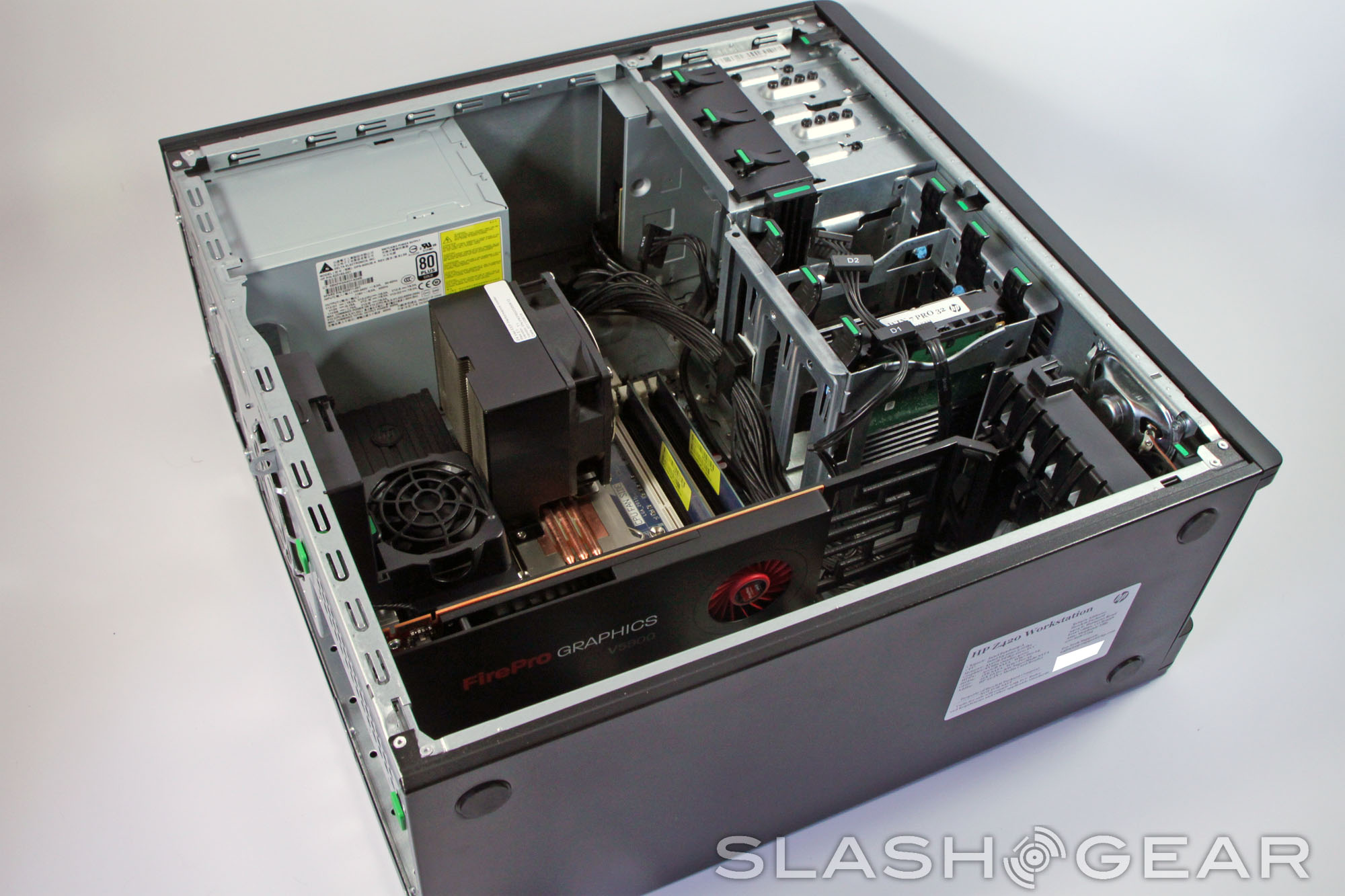 Our test unit came equipped with an eight-core Intel Xeon E5-1620 CPU clocked at 3.6Ghz, a relatively modest 8GB of memory and 1TB 7200RPM hard drive, and an AMD FirePro V5900 professional graphics card. Other additions include a multi-card reader and an extra guide and fan assembly for the graphics card. For these parts the total comes to $2762, up from the base price of $1169. A maxxed-out Z420 with the top end processor and graphics, an NVIIDA Quadro 5000 graphics card, 64GB of memory, huge SSDs and hard drives, integrated carrying handles and the like pushes towards $12,000.