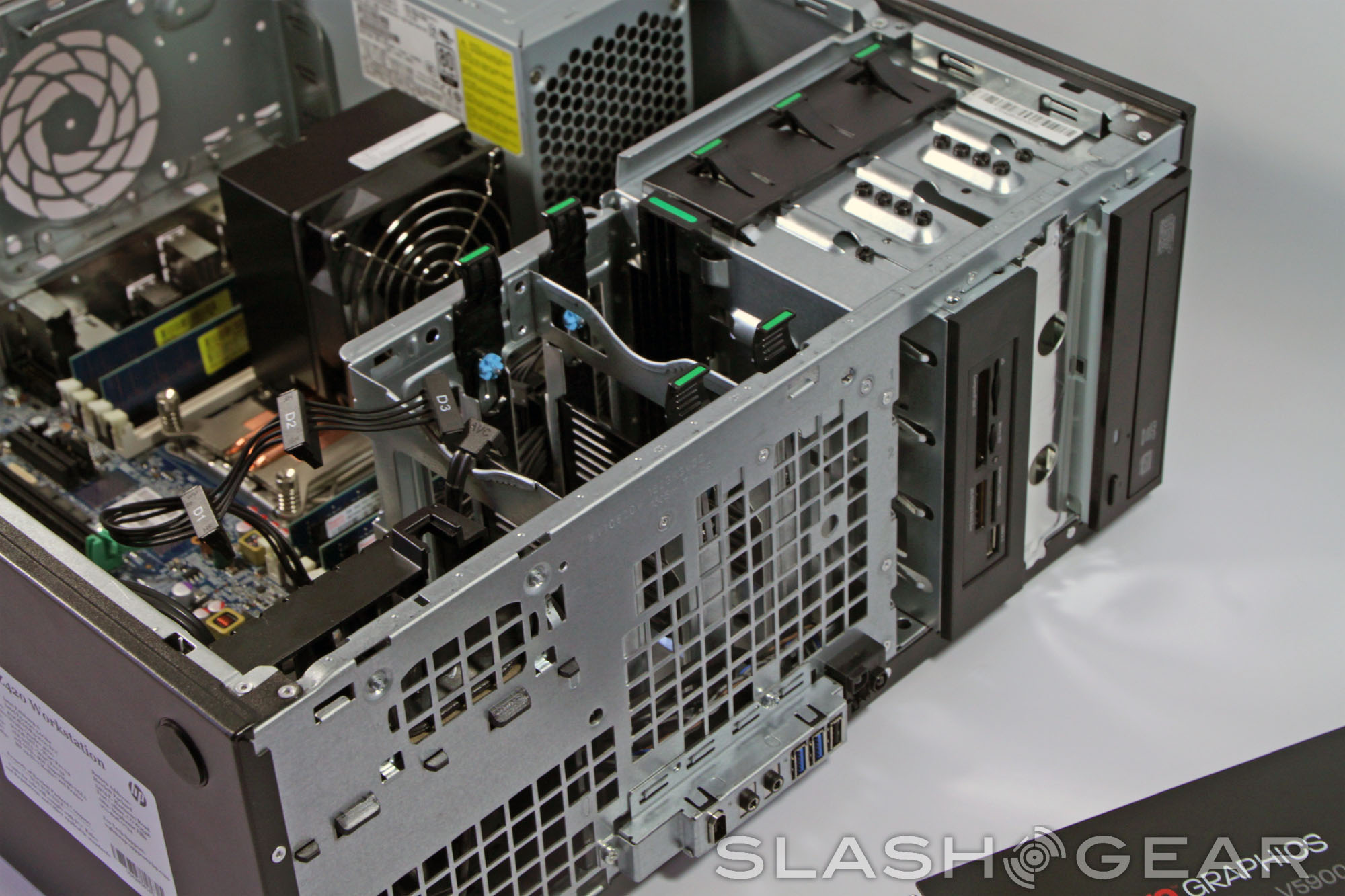 For those interested in the Z420 or one of its bigger brothers in an IT environment, you really shouldn't pay attention to the components. These are staggeringly configurable and in any case, the tower form factor is designed for replacements and upgrades. The case itself is of some interest to us here. HP's workstations are renowned for being tough, and indeed this is the case: steel and hard plastic are hard to mess up. But what caught my eye is just how easy it is to add and remove parts, thanks to an ingenious system of tabs, handles, slides and slots.